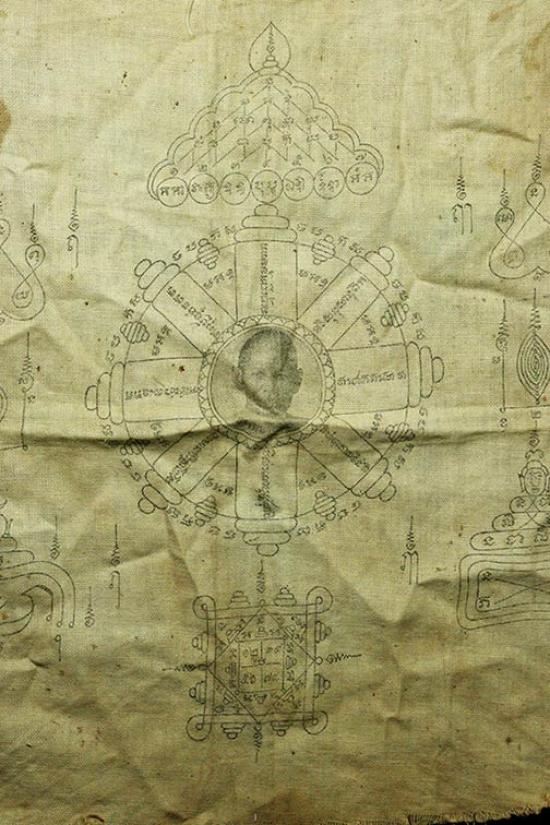 ผ้ายันต์ ผ้าดิบ รูปถ่ายสกรีน เก่า ไม่ทราบที่ ..ขนาด 11x11 นิ้ว