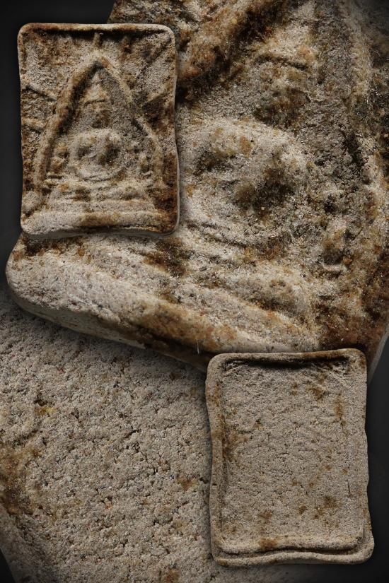 #องค์พระพุทธชินราช และพระสารีบุตร (พระอัครสาวกฝ่ายขวา) พระโมคคัลลานะ (พระอัครสาวกฝ่ายซ้าย) เนื้อหากดแน่นมองเห็นเป็นรูปร่างชัดเจน #ด้านหน้าติดเกศาหลวงปู่แหวนและผงตะไบพระพุทธรูปเก่า มาเต็มๆ เลยครับ ด้านหลังพระผงเป็นลายยันต์พระอาจารย์คำบ่อ คล้ายยันต์พระเจ้า ๕ พระองค์