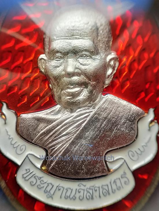 เหรียญห่วงเชื่อม รุ่นแรก "เจ้าสัว มหามงคล" พระญาณวิสาลเถร (หลวงปู่หา สุภโร) หรือ หลวงปู่ไดโนเสาร์ วัดสักกะวัน(ภูกุ้มข้าว) อ.สหัสขันธ์ จ.กาฬสินธุ์ ปี ๒๕๖๓ เนื้อนวโลหะ หน้ากากเงิน คุ้ยพื้นลงยาสีส้ม(แสด) ลงยาโบว์ขาว ด้านหน้าตอกโค๊ต จีน ด้านหลังตอกโค๊ต เลข ๑๑๖ คัดเก็บผิวสวยเดิม จมูกโด่ง พร้อมกล่องเดิมครับ