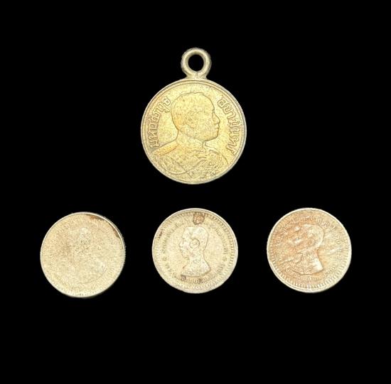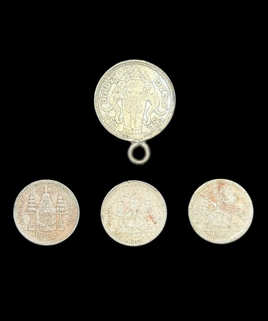 เคาะเดียวแดง 4 เหรียญ เหรียญบาทหนึ่ง ร.5 หลังตราแผ่นดิน พิมพ์เล็ก 3องค์ และ เหรียญหนึ่งบาท เหรียญหนวด รัชกาลที่6 หลังช้างสามเศียร เนื้อเงิน |