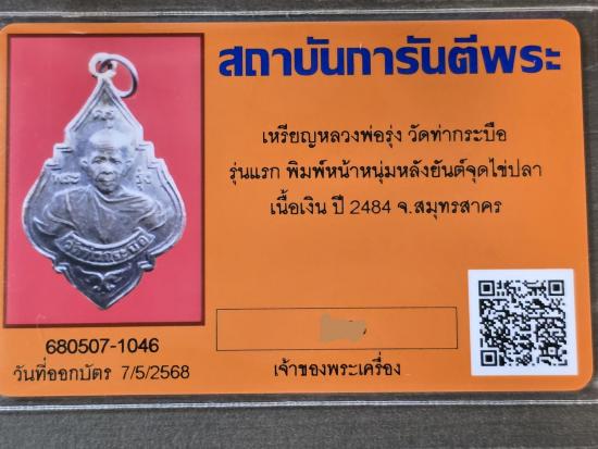 ***เหรียญ-หลวงพ่อรุ่ง หน้าหนุ่ม วัดท่ากระบือ เนื้อเงิน -หลังยันต์จุดไข่ปลา พ.ศ.2484 พร้อมบัตรรับรองครับ