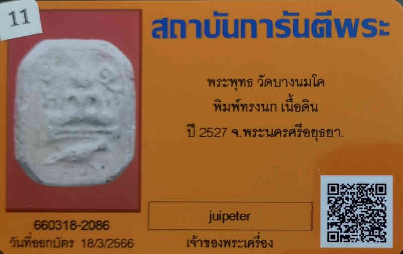รายการนี้เป็นพระเนื้อดินเผาพิมพ์หลวงพ่อปานทรงนก วัดบางนมโค พระองค์นี้จัดสร้างในปี พ.ศ.2527 มีมวลสารเก่าของพระหลวงพ่อปานผสมอยู่เป็นจำนวนมาก ผงอุดเก่าตามสูตรโบราณ กำลังเป็นที่นิยม ใช้แทนพระหลวงพ่อปานยุคแรกองค์หลักแสน หลักล้านได้อย่างสบายใจ