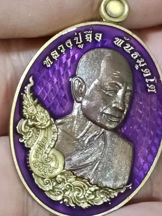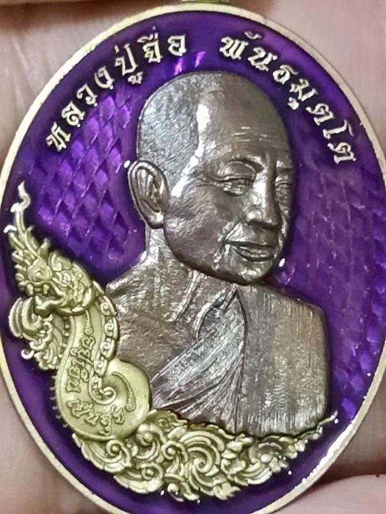 เหรียญอยู่เย็น เป็นสุข หลวงปู่จื่อ วัดเขาตะเงาะอุดมพร จ.ชัยภูมิ เนื้อทองทิพซาติน พื้นม่วง หน้ากากนวะ โค๊ต จ หมายเลข 22 |