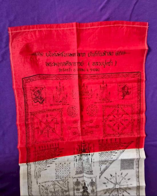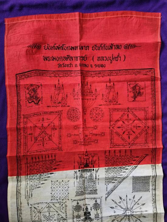 ผ้ายันต์พัดโบกมหาลาภ ยันต์กันฟ้าลง พระมงคลศิลาจารย์ หลวงปู่คร่ำ วัดวังหว้า ระยอง ขนาดใหญ่ ผ้าแข็ง สวยๆครับ *ขนาด 58 X 113 ซ.ม.* มีตราวัดครับ