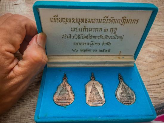 เหรียญชุด 3 องค์ พิมพ์พระแก้วมรกต 3 ฤดู เนื้อทองแดง สร้างเนื่องในพิธีเปิดสำนักงานใหญ่ ธนาคารกรุงไทย วันที่ 26 พฤศจิกายน 2525 พระดี พิธีใหญ่ หลักฐานชัดเจน ปลุกเสกโดยพระเกจิดังในยุคนั้นมากมาย หนึ่งในนั้นมี หลวงปู่ดู่ วัดสะแก ร่วมปลุกเสก เริ่มหายากแล้วครับ
