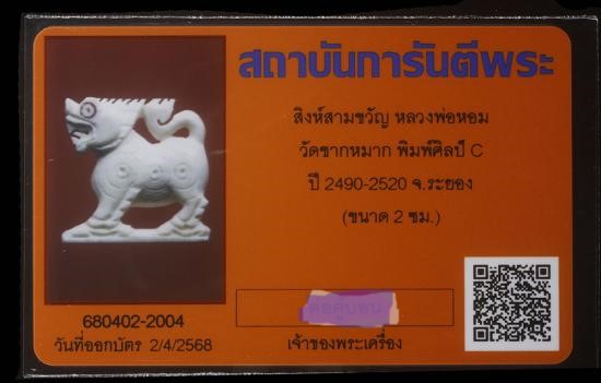 สิงห์งาแกะ หลวงพ่อหอม วัดชากหมาก สามขวัญ หัวมังกร นิยม พิมพ์ศิลป์ B ปี 2490 จ.ระยอง ขนาดใหญ่ 2.0 ซม. หล่อๆ อ้วนๆ ล่ำๆ หนาๆ พร้อมบัตรรับรอง
