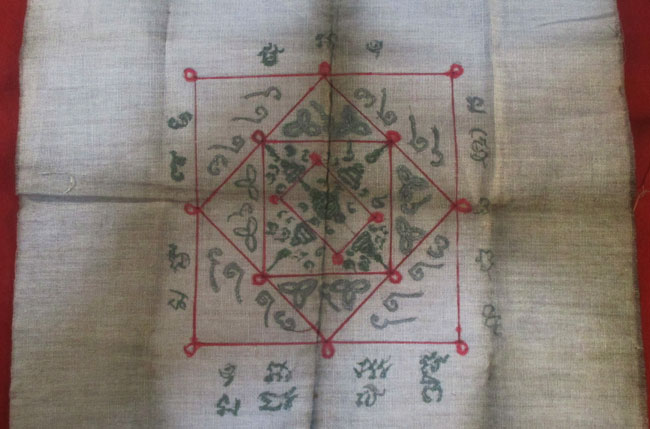 ผ้ายันต์ ไม่ทราบที่ จารยันต์ด้วยมือ เนื้อผ้าดูเก่า ครับ