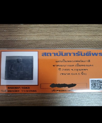 แผ่นยันกันไฟ หลวงพ่อโอภาษี ปี2495 พร้อมบัตรรับรอง หายากครับ