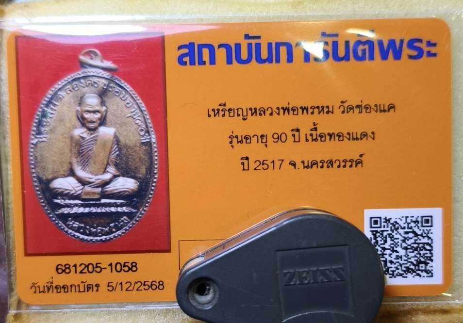 เหรียญหลวงพ่อพรหม วัดช่องแค รุ่น 90ปี 2517 พร้อมบัตรรับรอง