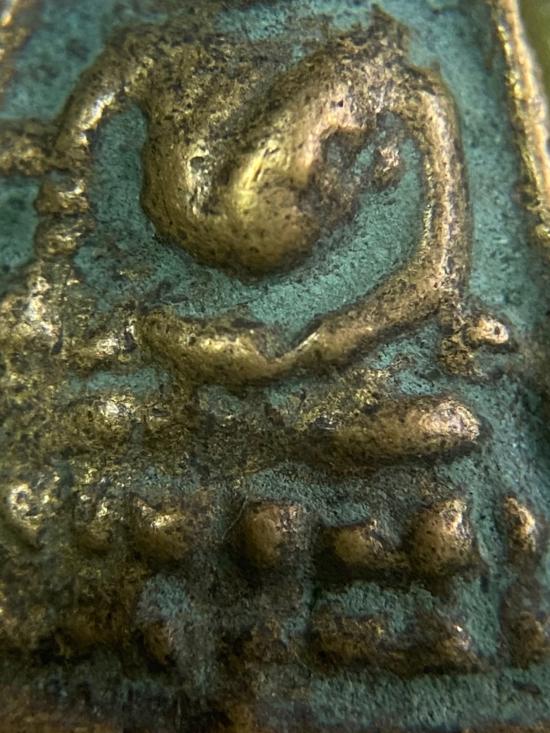 หลังมีอักขระยันต์ ลายตาราง ดูเป็นงานหล่อเก่า |