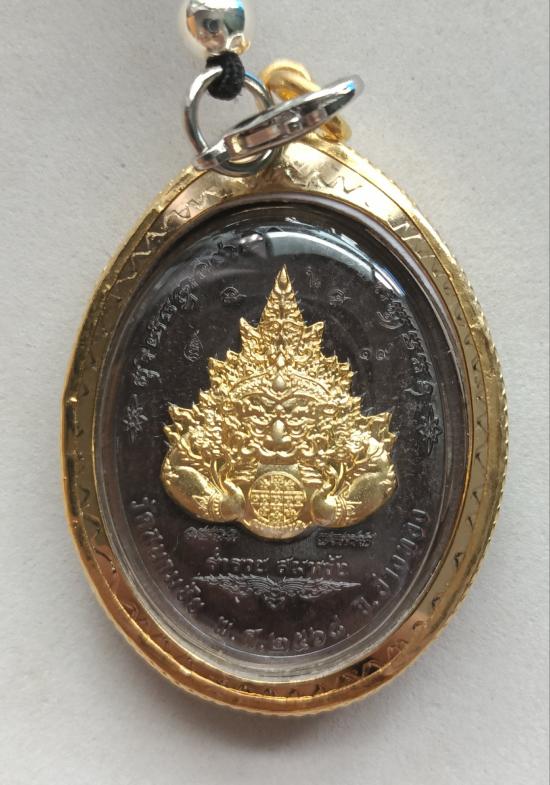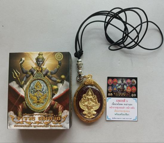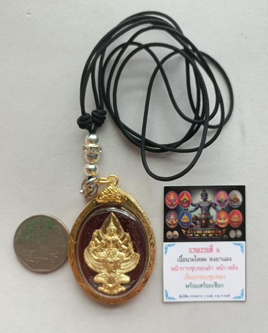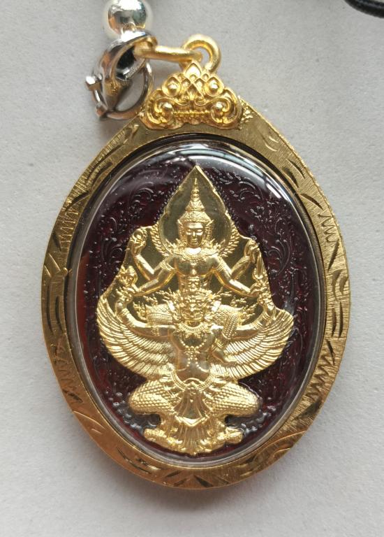 วัดใจเคาะเดียวแดงจ้า เหรียญพระนารายณ์ทรงครุฑ เนื้อนวะลงยาแดง หน้ากากชุบทองคำหน้า หลัง เลี่ยมกรอบชุบทอง พร้อมสร้อยเชือก หลวงพ่อสมหวัง วัดสนามชัย เคาะเดียวแดงจ้า