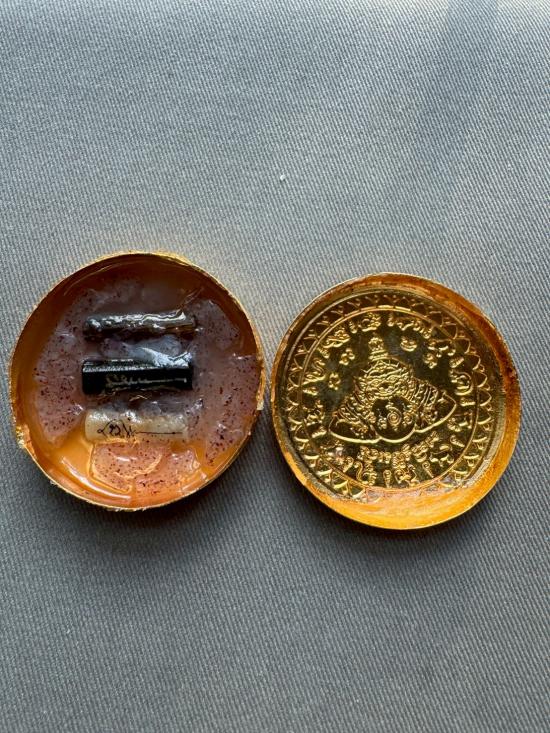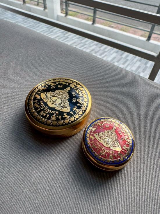 เคาะเดียวไวไว ตลับสีผึ้งพระราหู มหานิยมอุดมโชค จตุคามรามเทพ รุ่น มงคลจักรวาล ปี2549 พิมพ์ใหญ่ ขนาด5.5ซม ลงยาดำ+พิมพ์เล็กลงยาแดง ขนาด3.2ซม ลงเบญจรงค์น้ำทอง สีผึ้งด้านในเดิมๆ