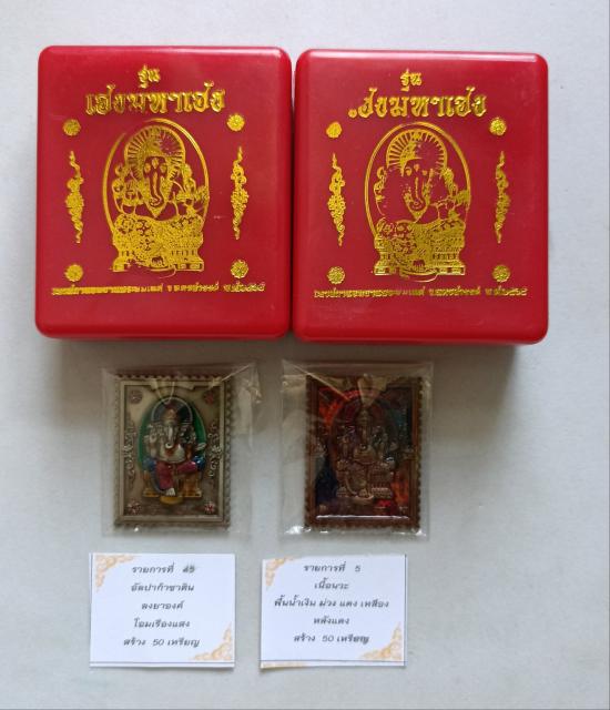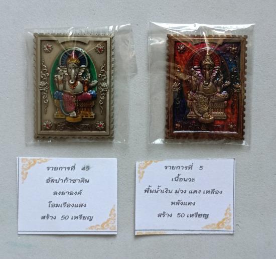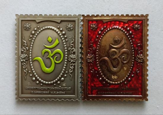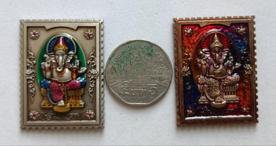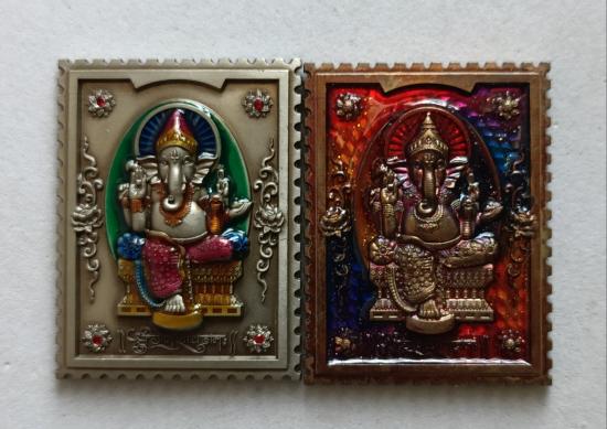 วัดใจเคาะเดียวแดงจ้า เหรียญแสตมป์พระพิฆเนศ เนื้อนวะลงยาหน้า หลัง+อัลปาก้าซาตินลงยาโอมเรืองแสง เคาะเดียวแดงจ้า