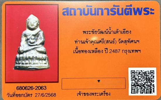 พระชัยวัฒน์น้ำเต้าเอียง เจ้าคุณศรี(สนธ์) วัดสุทัศนวราราม ปี 2487 พร้อมบัตรรับรอง