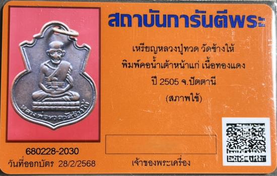 เหรียญหลวงปู่ทวด พิมพ์น้ำเต้าหน้าแก่ (นิยม) ปี 2505 พิธีใหญ่ พร้อมบัตรรับรอง