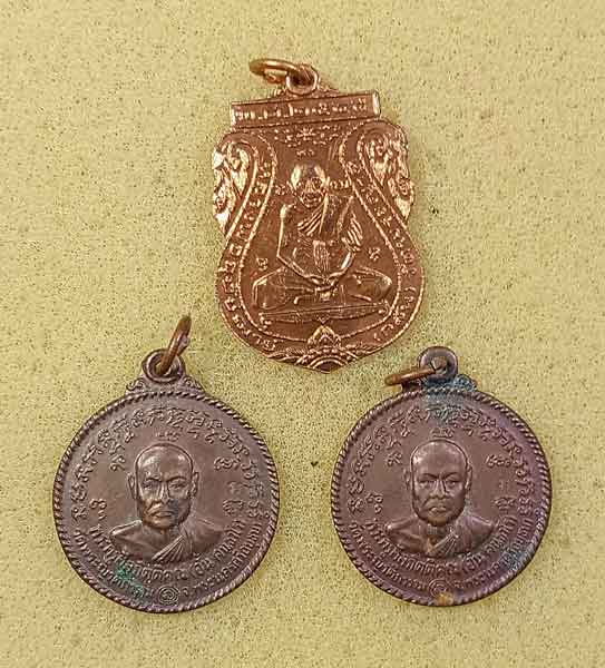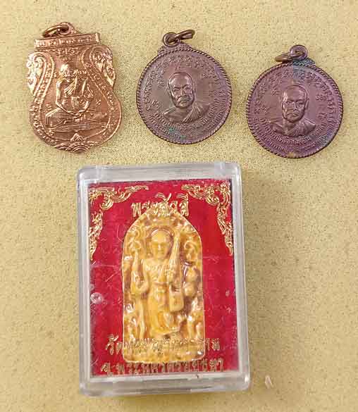 เหรียญไตรมาส ปี45 หลวงพ่อกลั่น วัดพระญาติ + เหรียญกลมหลวงพ่ออั้น วัดพระญาติ เนื้อทองแดง ปี 2536 2 เหรียญ + พระสิวลีคลือบ วัดพระญาติ |