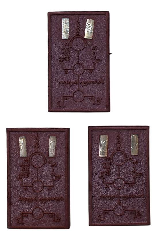 ชุด 3 องค์...เพชรพญาธร เนื้อมหาว่านพันนารีรัก ร้อยนารีหลง ผสมว่านเสน่ห์จันทร์แดง (ผงมวลสารล้วน ครูแรงเต็มสูตร) โรยชนวนอาถรรพณ์ หลังยันต์หุ่นมหาเสน่ห์ ฝังตะกรุดเงินลงนะเมตตา 2 ดอก มวลสารครู ปี 2552 หลวงปู่เฉลิม วัดบุญนาคประชาสรรค์ จ.สมุทรสงคราม พร้อมซองรูปใบฝอยเดิมจากวัด สภาพพระตามรูปที่ลงทุกประการ (ขนาดประมาณ 4.7 x 2.9 ซม.)