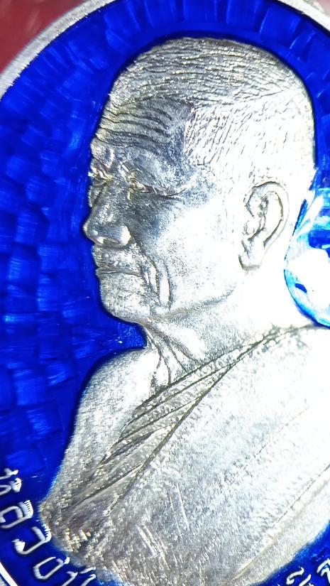เหรียญรูปไข่หันข้าง เลื่อนสมณศักดิ์ รุ่นแรก ปี 2564 หลวงปู่มหาศิลา หลวงปู่ศิลา สิริจันโท จ.กาฬสินธุ์ เนื้อเงินลงยาสีน้ำเงิน หมายเลข 163 มีกล่องเดิม |