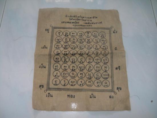 วัดใจเคาะเดียว.......100.......ผ้ายันต์เสริมดวงชะตาชีวิต วัดไตรมิตร อยู่เย็นเป็นสุข มั่งมีศรีสุข เงินทองมั่นคง เป็นผ้ายันต์พิธียุคแรกๆของท่านเจ้าคุณธงชัย ผ้าดิบเก่าๆ ขนาด 8 x 10 นิ้ว