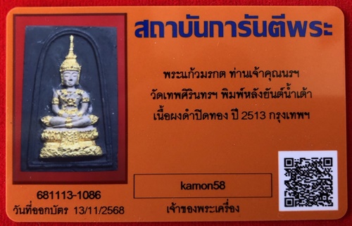 พระแก้วมรกต ท่านเจ้าคุณนรฯ วัดเทพศิรินทรฯ พิมพ์ใหญ่ หลังยันต์น้ำเต้า เนื้อผงดำปิดทอง ปี 2513 สวยเดิม มาพร้อมบัตรรับรองครับ
