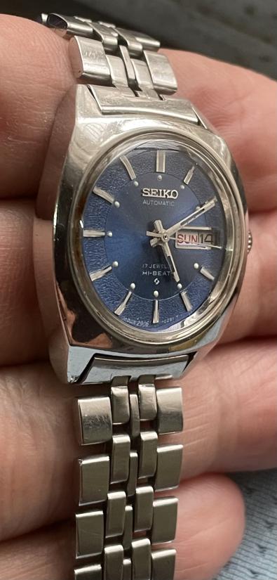 รายละเอียด นาฬิกา Seiko Hi-Beat Automatic 17jewels 24mm.(ไม่รวมเม็ดมะยม) 2 หน้าต่าง หน้าปัดสีน้ำเงินคลาสสิค วันและวันที่ ปรับเปลี่ยนเร็วได้ สามารถขึ้นลานมือช่วยได้ เดินปกติ สภาพสวย น่าใช้งาน