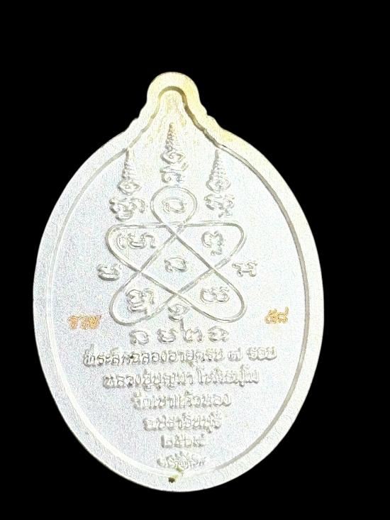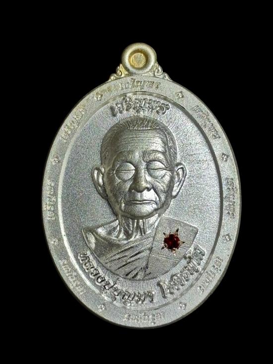 เหรียญ เจริญพรหลับตา หลวงปู่บุญมา สำนักสงฆ์เขาแก้วทอง จ.ปราจีนบุรี ปี 2567 ที่ระลึกอายุครบ 7 รอบ เนื้อชุบเงินพ่นทราย ฟังพลอยแดงสังฆาฏิ จัดสร้าง 99 เหรียญ เลข ๕๘ พร้อมกล่องเดิม