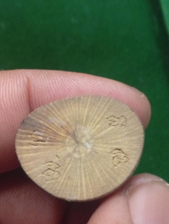 ที่สังฆาฏิจาร "มะอะอุ", ด้านหลังจาร"ยันต์ห้า", ใต้ฐานจาร"นะชาลีติ" ความสูง 1.5 นิ้ว ฐานกว้าง 1 นิ้ว เก็บเก่าผิวหิ้งแห้งๆเดิมๆ