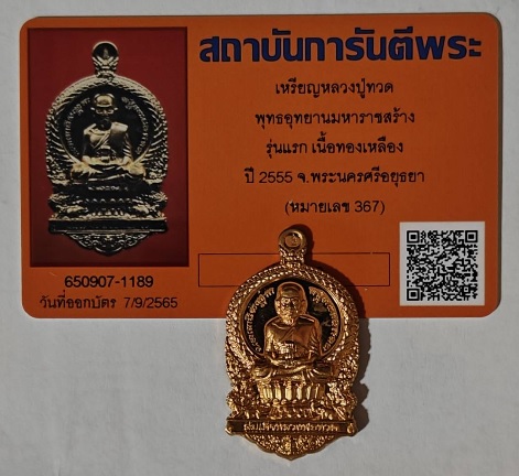 เหรียญหลวงปู่ทวด เนื้อทองเหลือง ปี 2555 รุ่นแรก พุทธอุทยานมหาราชสร้าง จ.พระนครศรีอยุธยา "หมายเลข 367" พิธีใหญ่ สภาพสวย ไม่ผ่านการใช้งาน พร้อมบัตรรับรองพระแท้ |