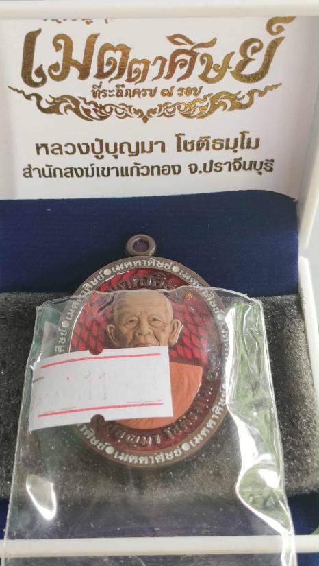 เหรียญ"เมตตาศิษย์"ที่ระลึกครบ๗รอบ หลวงปู่บุญมา โชติธัมโม วัดเขาแก้วทอง จ.ปราจีนบุรี เนื้อนวะโลหะ คุ้ยพื้นลงยาแดง หน้ากากเพ้นท์ หลังหลวงพ่อโสธร หมายเลข ๓๙ พร้อมกล่องกำมะหยี่ พระสวยมากคับ