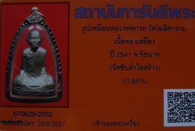 รูปเหมือนหลวงพ่อกวย วัดโฆสิตาราม เนื้อทองเหลือง ปี 2541 จ.ชัยนาท (วัดซับลำใยสร้าง) หลวงปู่หมุน วัดบ้านจาน ปลุกเสก พร้อมบัตรรับรอง (ไม่มีกรอบทองแล้ว) พร้อมเลี่ยมกรอบพลาสติก