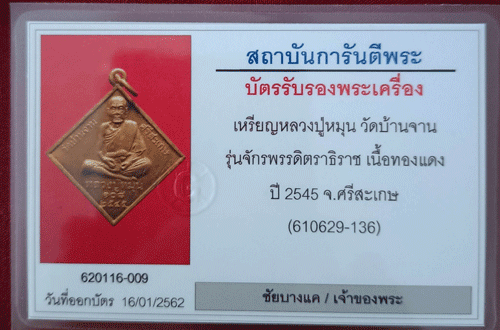 เหรียญหลวงปู่หมุน รุ่นจักรพรรดิ เนื้ิอทองแดง ปี 2545 จ.ศรีสะเกษ พร้อมบัตรรับรองครับ