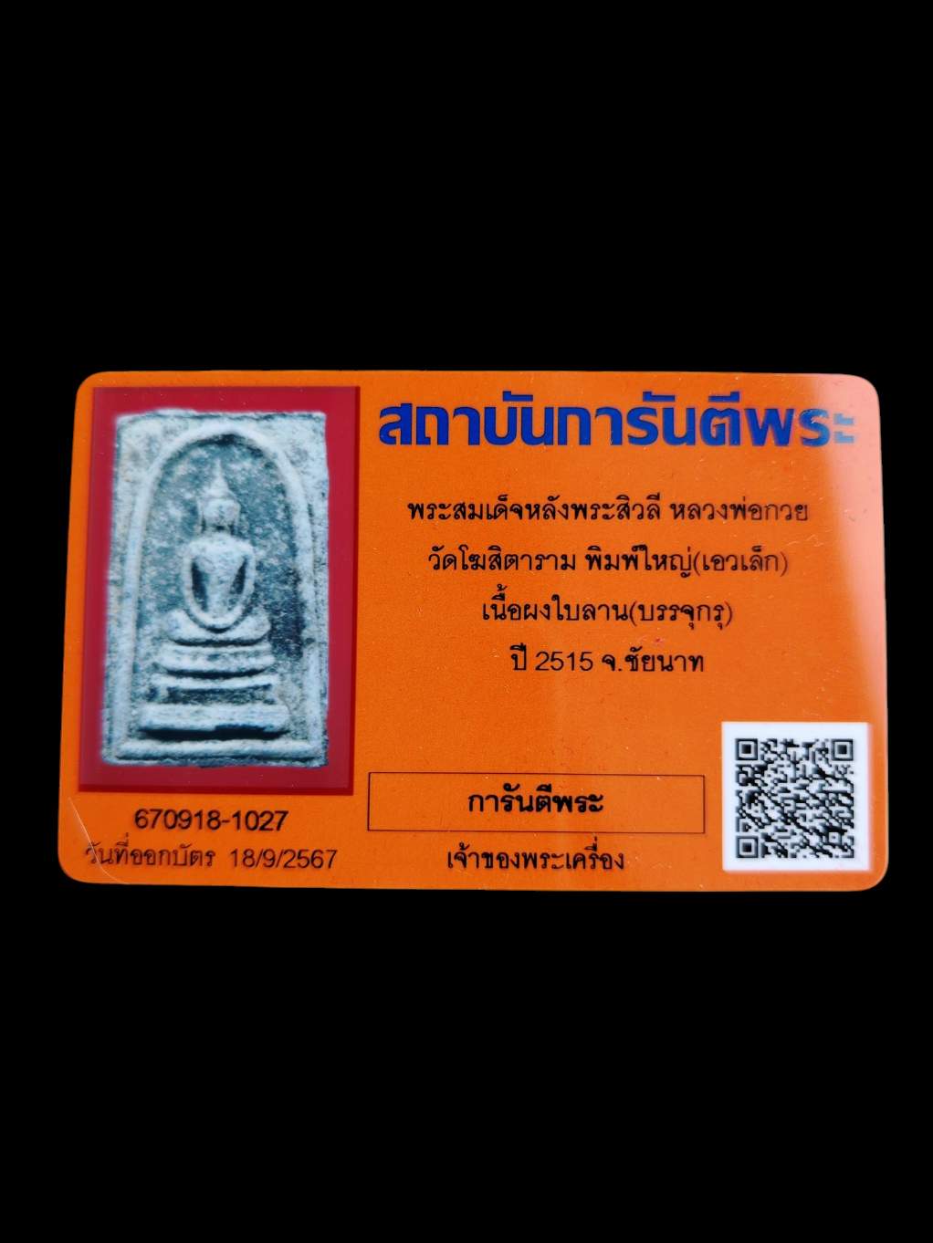 สมเด็จ หลังสิวลีหลวงพ่อกวยพิมพ์ใหญ่เอวเล็ก เนื้อผงใบลานบรรจุกรุ พร้อมบัตรรับรอง