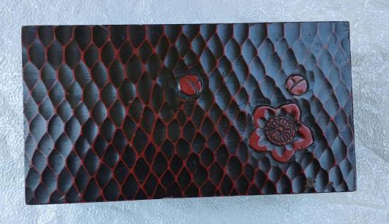 ***วัดใจ***กล่องไม้วินเทจญี่ปุ่นกล่องใส่เครื่องประดับไม้แกะสลักคามาคุระ-โบริ (Kamakura-bori) เคลือบเงาในรูปแบบดอกบ๊วยและลวดลายเกล็ดปลาสีแดง-ดำ ขนาด 11 X 6 นิ้ว สูง 4.5 นิ้ว