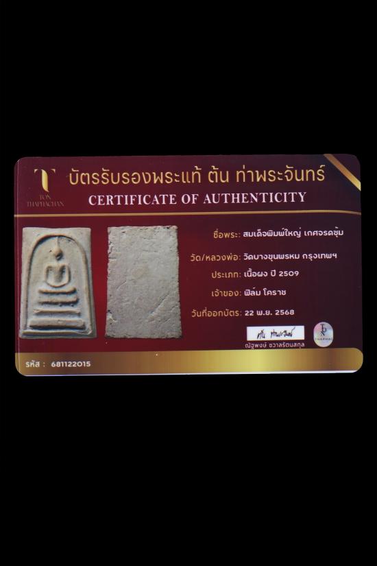 สมเด็จบางขุนพรหมพิมพ์ใหญ่ เกศจรดซุ้ม ปี09 รับประกันแท้บัตรต้นท่าพระจันทร์