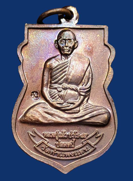 เหรียญปลดหนี้ หลวงปู่แผ้ว ปวโร หน้าหลวงปู่ทวด หลังหลวงปู่แผ้ว วัดรางหมัน ปี 2550 ผิวสวยๆ รุ้งๆ |