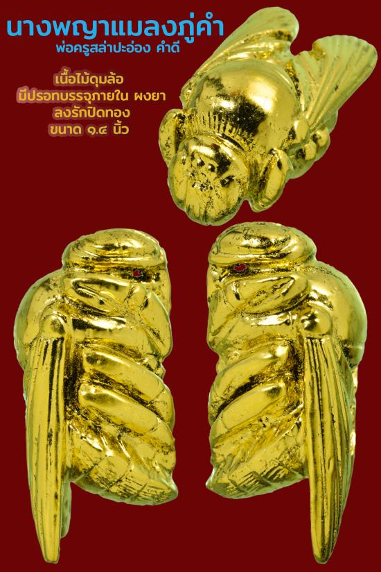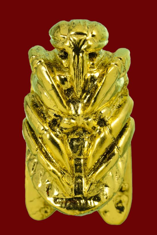 แมลงภู่คำ วัสดุหลัก เนื้อไม้ดุมล้อ ส่วนประกอบ มีปรอทบรรจุภายใน การตกแต่ง ลงรักปิดทอง ขนาด ๑.๔ นิ้ว ผู้แกะ/ผู้สร้าง พ่อครูสละปะอ่อง คำดี |