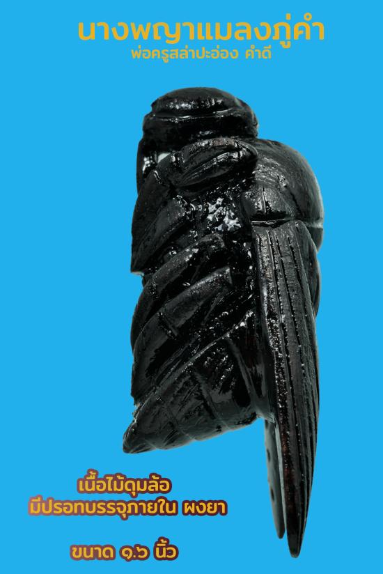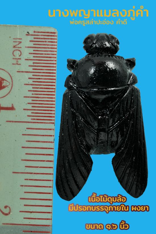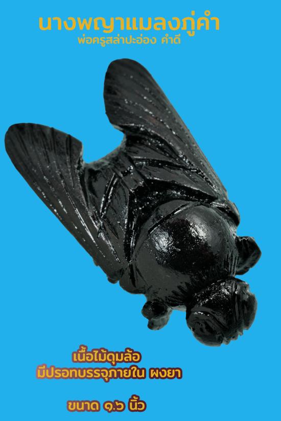 แมลงภู่คำ วัสดุหลัก เนื้อไม้ดุมล้อ ส่วนประกอบ มีปรอทบรรจุภายใน การตกแต่ง ลงรัก ขนาด 1.6 นิ้ว ผู้แกะ/ผู้สร้าง พ่อครูสละปะอ่อง คำดี |