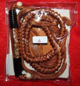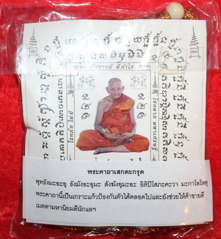 ตะกรุดมีความยาวประมาณ 3.5 นิ้ว ลงรัก ปิดทอง พร้อมเชือกถักคาดเอว ยาวประมาณ 90 ซ.ม. คั่นเม็ดด้วยประคำกระดูกช้าง 2 อัน พร้อมแผ่นยันต์สารพัดกัน และคาถาบูชาเดิมๆ จากวัด |