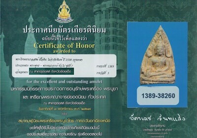 พร้อมใบประกาศรางวัลที่ 3 จากสมาคมผู้นิยมพระเครื่องพระบูชาไทย จ.ร้อยเอ็ด