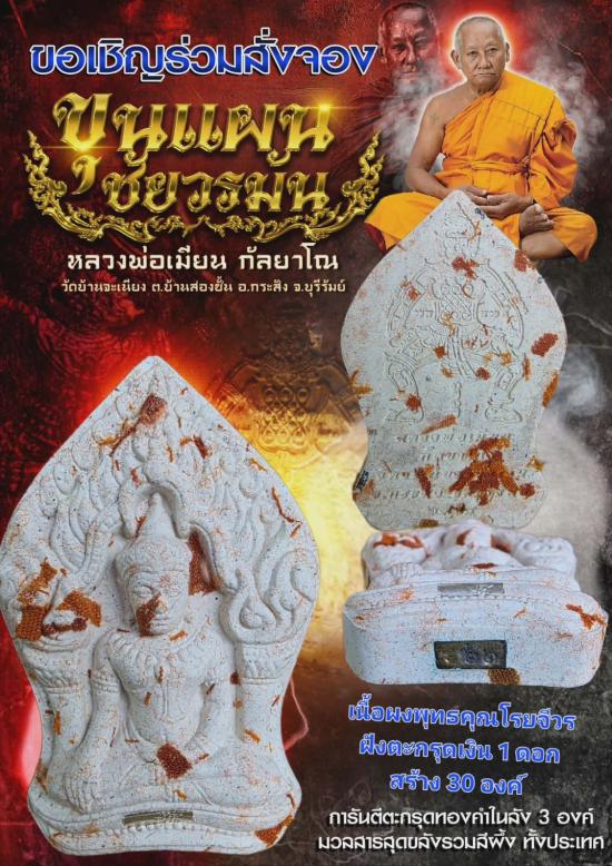 พระขุนแผนชัยวรมันหลังหุ่นพยนต์ หลวงพ่อเมียน วัดจะเนียง บุรีรัมย์ หลวงปู่มหาศิลา (หลวงปู่ศิลา)อธิษฐานจิต เนื้อผงพุทธคุณโรยจีวรฝังพลอยฝังตะกรุดเงิน 1 ดอก จำนวนสร้างน้อยเพียง 30 องค์เท่านั้น มวลสารเข้มขลัง สวย หายาก ปัจจุบันวัตถุมงคล หลวงพ่อเมียนขยับราคาขึ้นทุกรุ่น พุทธคุณประสบการณ์ของพระเครื่องของท่านยิ่งมากและไม่ธรรมดา จนถึงประสบการณ์ที่ผู้บูชานับถือได้ประสบพบมากับตัวเองแล้วนั้นด้วย วัตถุมงคลหลวงพ่อเมียนประสบการณ์มากมาย ห้ามพลาดด้วยประการทั้งปวงแล้วครับ รับประกันชั้นหนึ่งครับ |