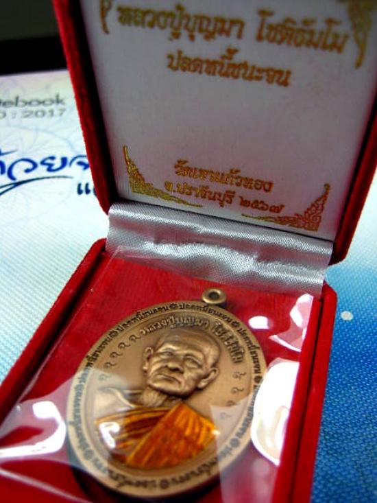 เหรียญรุ่นปลดหนี้ ชนะจน เนื้อทองแดงซาติน ตอกโค๊ต ๙ หลังลงยามังกร กล่องกำมะหยี่สภาพ 70 % หลวงปู่บุญมา โชติธมโม สำนักสงฆ์เขาแก้วทอง (---A67---)