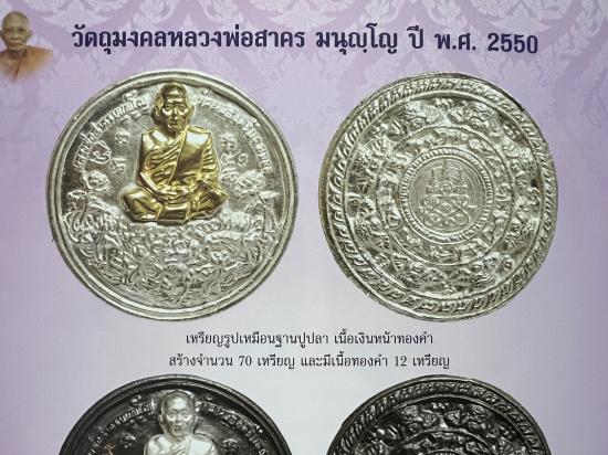 เหรียญรูปเหมือนฐานปูปลา เนื้อเงินหน้าทองคำ ปี2550 หลวงพ่อสาคร วัดหนองกรับ สร้าง70เหรียญ