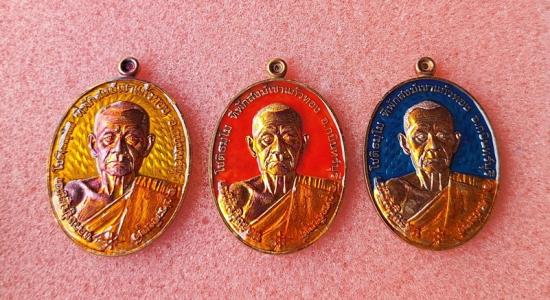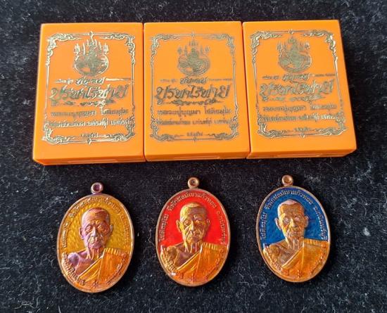หลวงปู่บุญมา โชติธมุโม จ.ปราจีนบุรี รุ่นชนะจน บรูพาไร้พ่าย เนื้อทองแดงลงยา3เหรียญ ปี2564