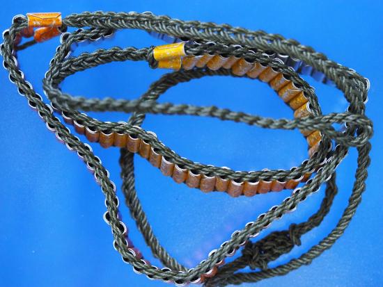 ตะกรุดสายคาดเอว ถักเชือกเขียว สามสี (3 กษัตริย์) 108 ดอก ยาว 38 นิ้ว (ทั้งสาย) สภาพสวยเดิม อายุไม่ต่ำกว่า 20 ปี เคาะแรก