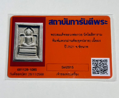 พระสมเด็จแหวกม่านหลวงพ่อกวย ปี 2521 เนื้อผง พิมพ์ต้อ วัดโฆสิตาราม จ.ชัยนาท ออกบัตรแล้วเรียบร้อย