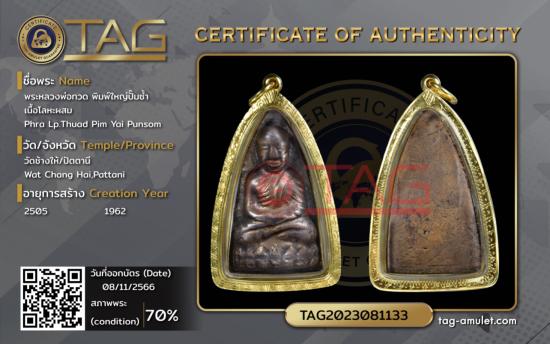 หลวงปู่ทวด พิมพ์ใหญ่ปั๊มซ้ำ เลี่ยมทองพร้อมบัตรรับรอง TAG Gold card byโทน บางแค