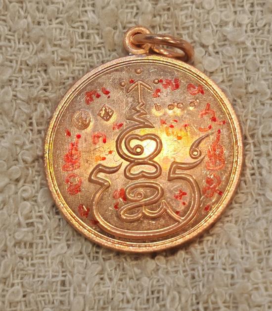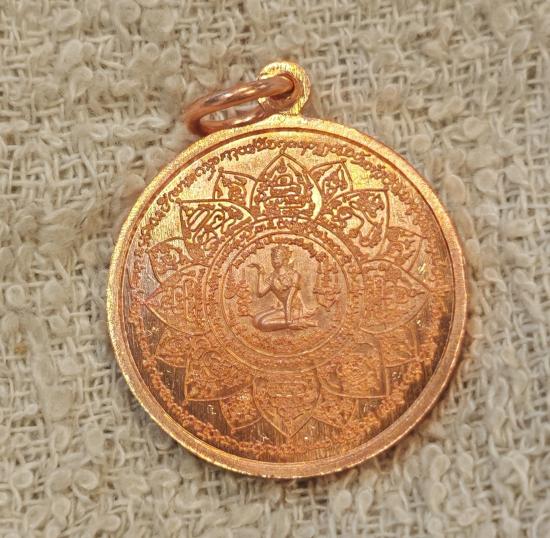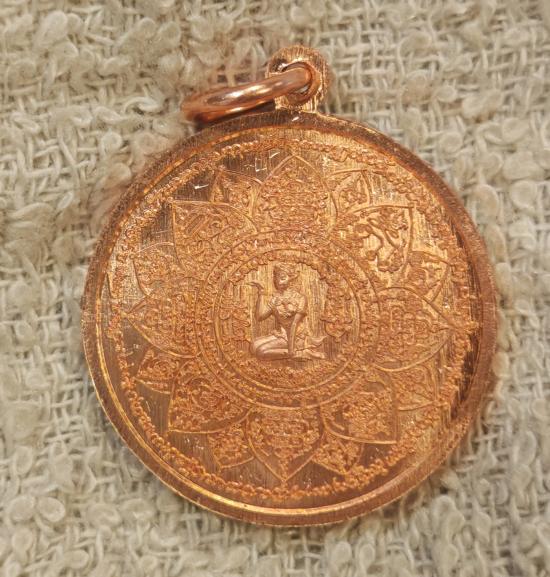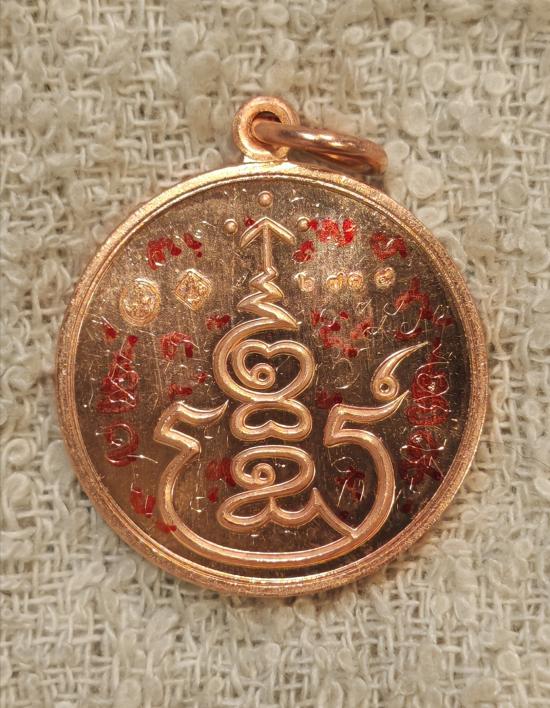หลังยันต์นางกวักในบัว ยันต์ชั้นสูงสายวังหน้า และเป็นเหรียญรุ่นแรกที่ใช้สัญลักษณ์ตัวแทนคุณพ่อป่อง น่วมมานา