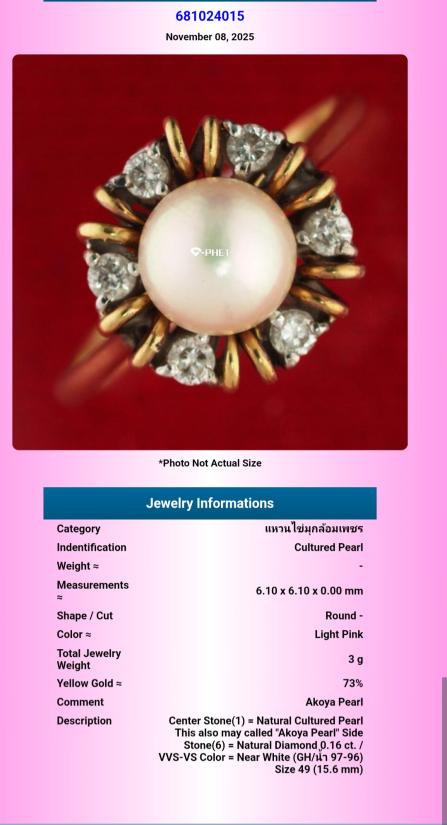 แหวนไข่มุกอะโกย่า (Akoya Pearl) สี Light Pink ตัวเรือน Gold 73% น้ำหนักรวม 3 กรัม size 49 *มีเซอร์G-Phet*