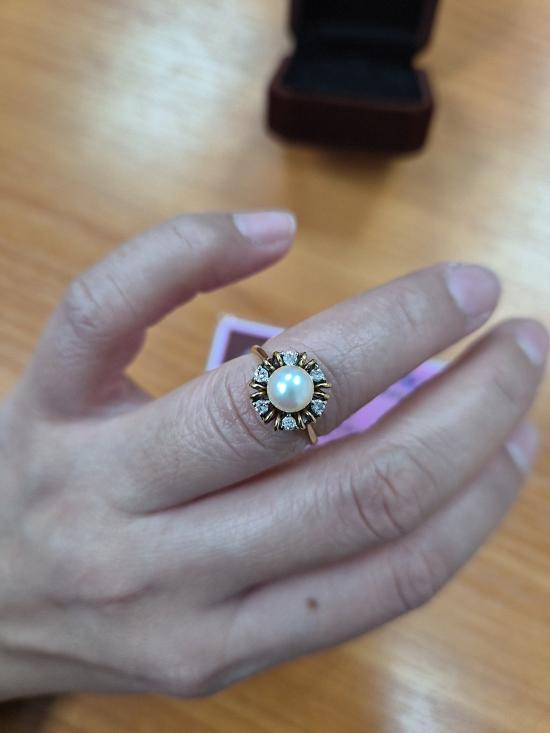แหวนไข่มุกอะโกย่า (Akoya Pearl) สี Light Pink โทนหวานละมุน ดูหรูคลาสสิกมากค่ะ ตัวเรือน Gold 73% น้ำหนักรวม 3 กรัม size 49