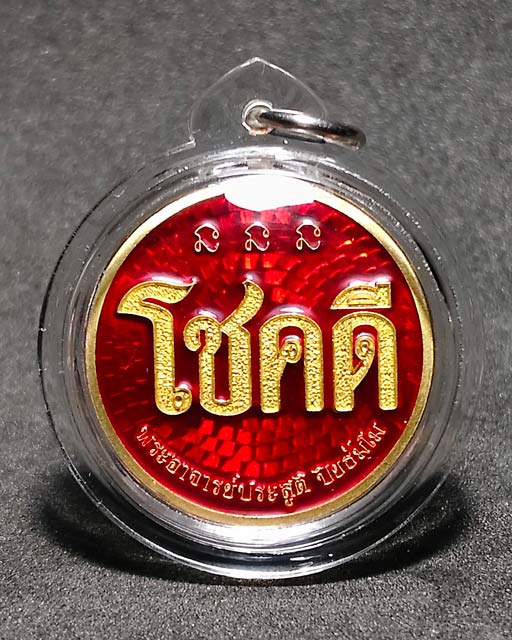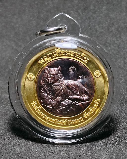 เหรียญโชคดี พญาเสือนอนกิน รุ่นแรก พระอาจารย์ประสูติ (หลวงพ่อประสูติ) วัดในเตา จ.ตรัง เนื้อทองทิพย์ลงยาแดง หน้ากากเสือโลหะอาถรรพ์ เลขสวยๆ 43